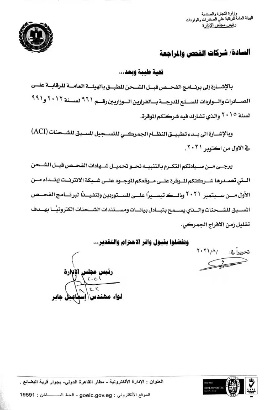根據2012年第961號和2015年第991號決議文件中所列商品進出口總組織實施的裝運前檢驗計劃。參考2021年10月1日起實施的海關裝運提前登記系統(ACI)。